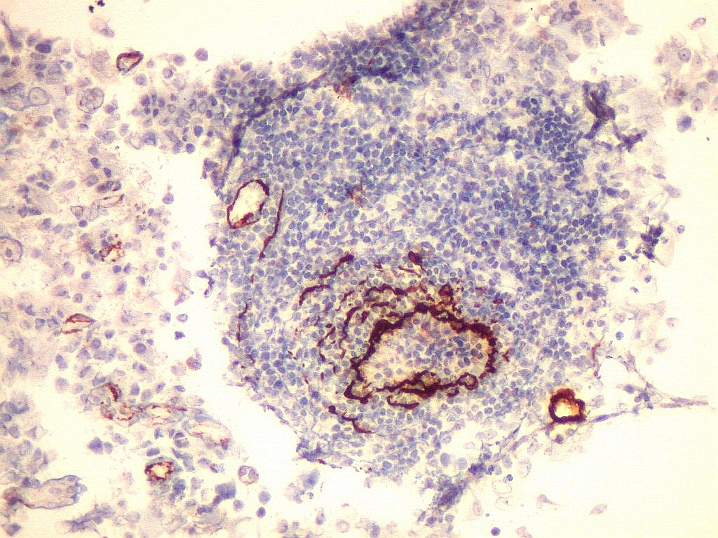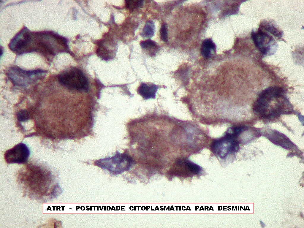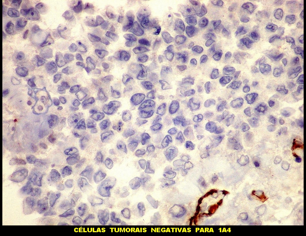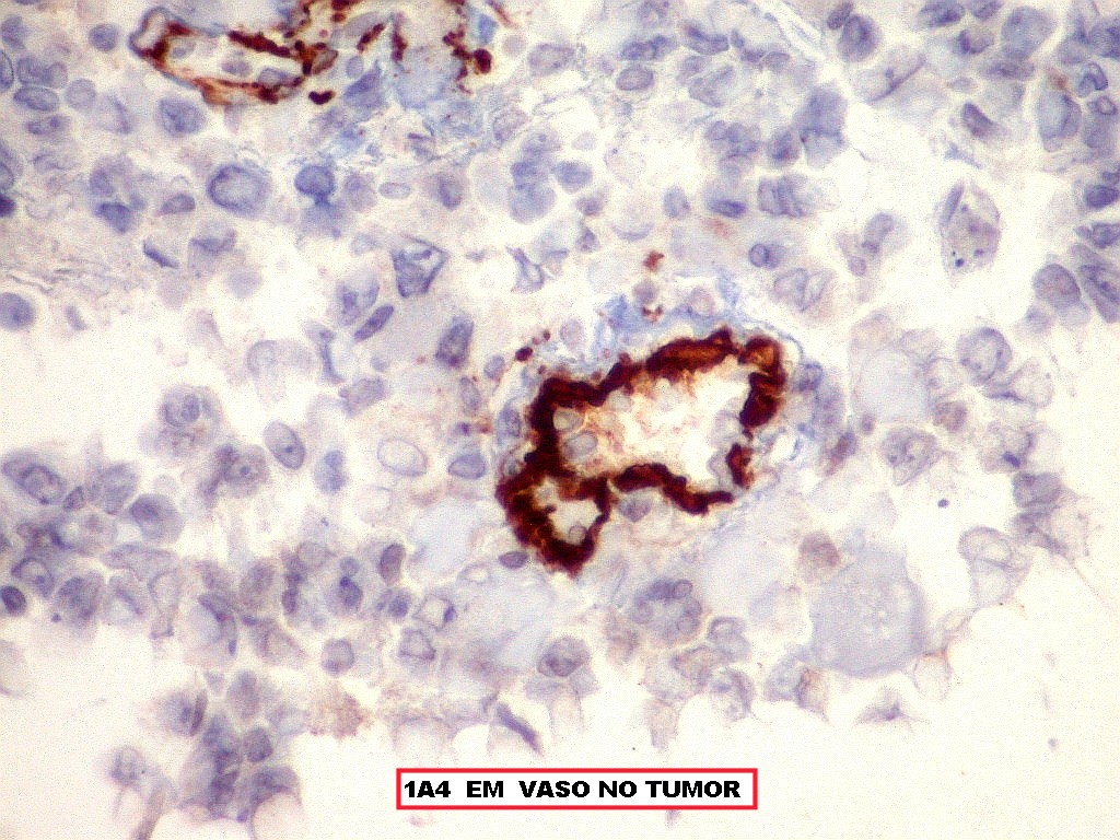 | 1A4. Actina alfa de músculo liso (smooth muscle actin), reconhecida pelo anticorpo 1A4. Ausente nas células neoplásicas, presente nos vasos do tumor. Para mais sobre este anticorpo, clique. |