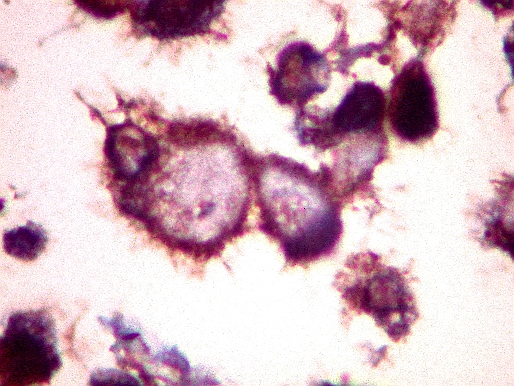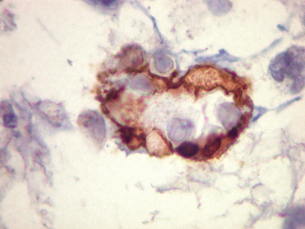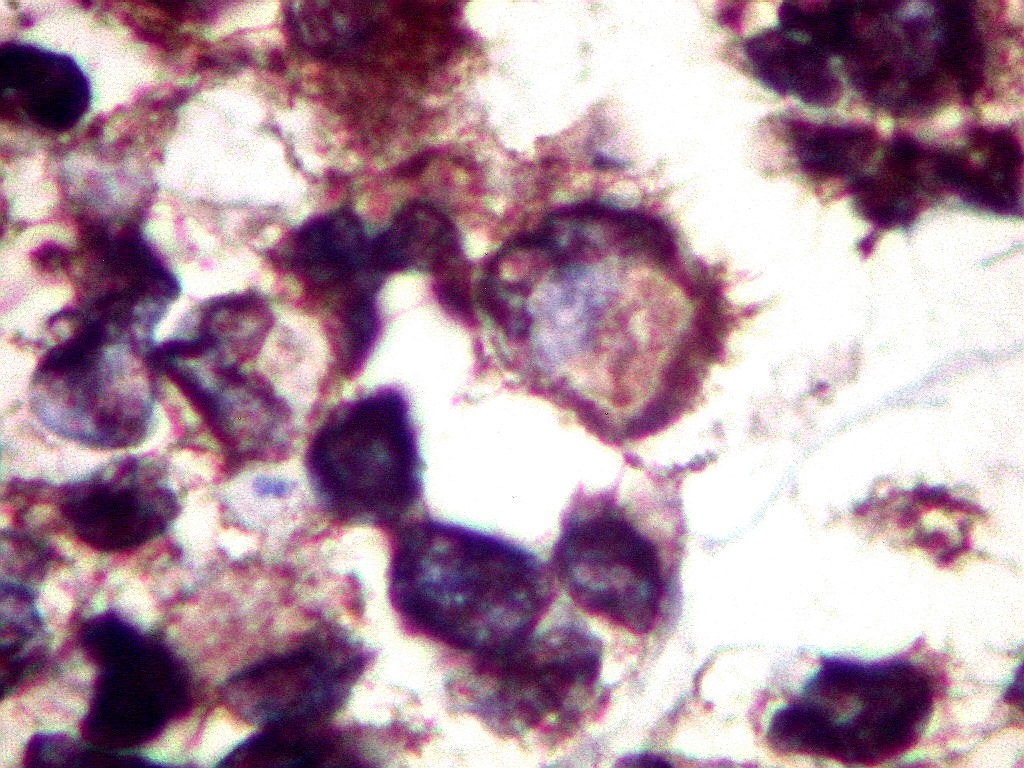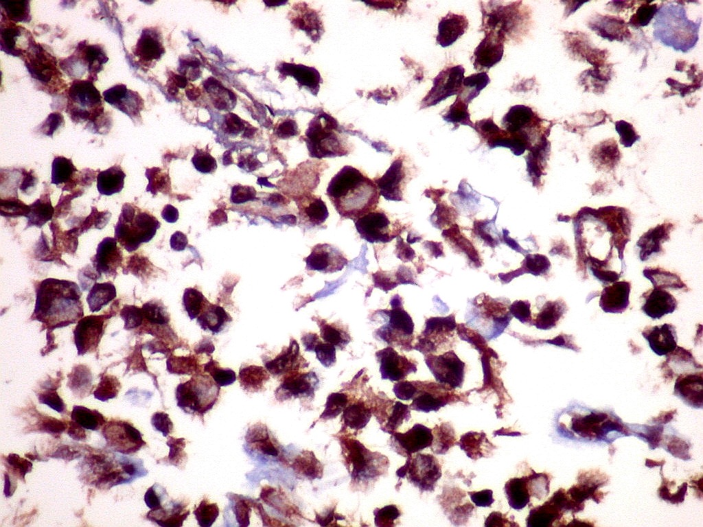 | HHF-35. Actina muscular específica é expressada no citoplasma das células rabdóides neoplásicas, indicando diferenciação muscular. Para mais sobre este anticorpo, clique. |
